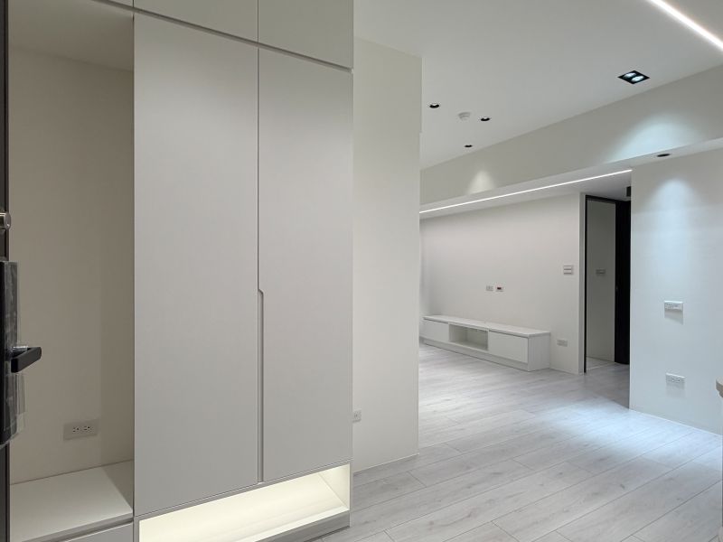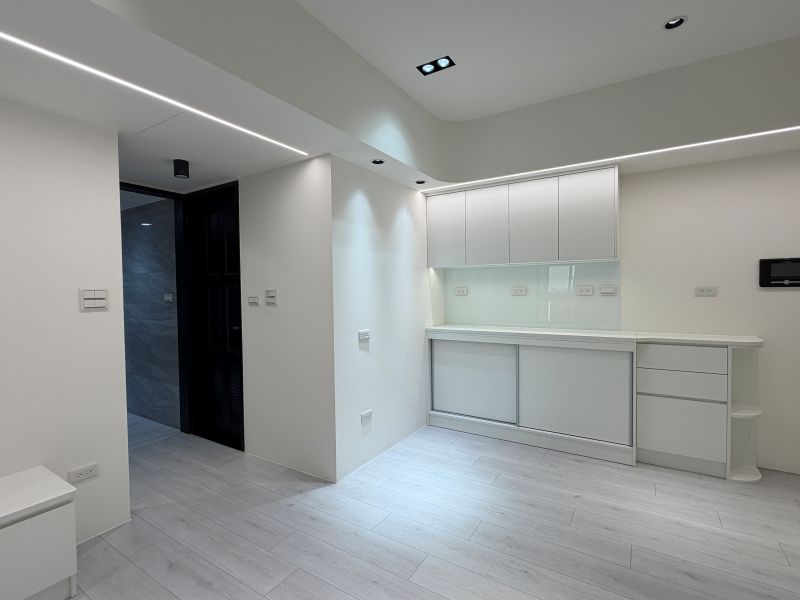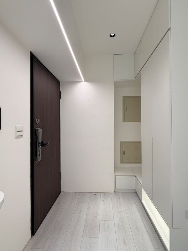 這是位於桃園青埔兩房新成屋裝修案,因為建商已做好廚具、衛浴、木地板,因此這次裝修重點便落在基礎的天花板、燈具、油漆、收納櫃體的需求。 這個案子令人印象深刻的地方,就是用色與燈光。 即便櫃體與油漆顏色幾乎全部都使用白色為主,但完工清潔後,竟然會有種讓人格外放鬆的舒適感,也許是外面世界紛擾雜訊太多,有時候回到家,反而會希望家是最純粹、最乾淨、最無壓的環境。 而白色就是有種魔力,因為它不搶戲不居功,它會把空間留給光線、也留給居住的人。 很多人以為白色很簡單,但其實白色也有分,也不是全白就一定好,而是要拿捏比例與層次,才不會讓白色顯得單調。所以很多設計看起來雖然簡單,但其實是很多細節慢慢堆砌出來的,例如:燈光、櫃體與空間比例…。 這個案子全室用了防眩光燈具,有些燈光讓你一抬頭就被光線刺進眼睛,長時間待在這樣的空間裡,眼睛很容易疲勞,也讓空間感覺有點急躁。因此在全白的世界裡,就需要使用防眩光燈具,讓眼睛也能好好休息。 燈光,是來照亮空間而不是來干擾居住者的,這樣的光線,讓整個家看起來更柔和、更安靜、更有質感,這就是讓生活更舒服的細節。 好的燈光配置,默默讓生活更舒服,不一定感到它的存在,但舒服自在無壓的感受,卻是每天下了班最需要的精神補充…。希望屋主在這樣的空間裡,享受剛剛好的無壓舒適,一切都很棒很完美! On Key 更多作品欣賞